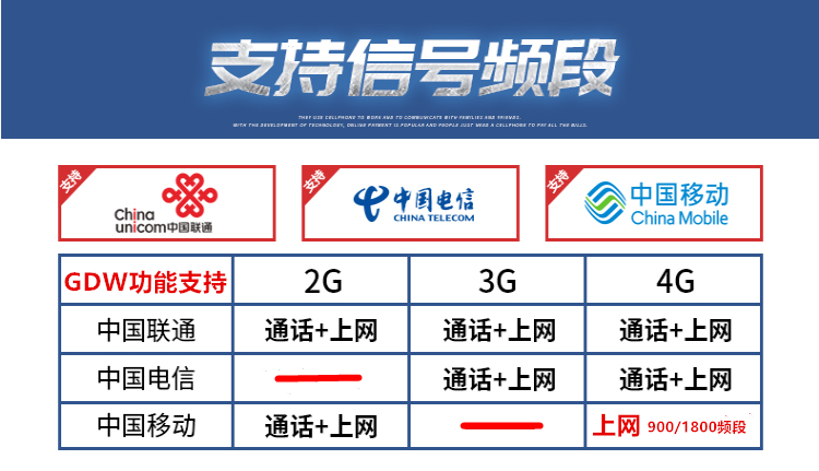 Frequency Range 頻率范圍 | GSM+DCS+WCDMA | 890~915/1710~1785 /1920~1980 MHz | 935~960/1805~1880 /2110~2170 MHz |