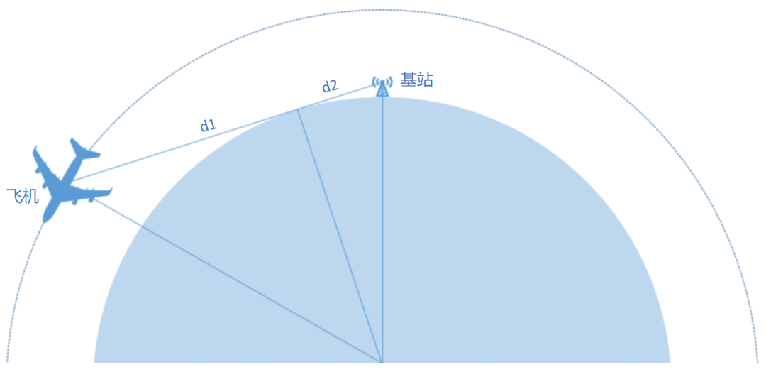 如圖所示,從基站的高度向地球作切線,并延長(zhǎng)該線直到和飛機(jī)在天上的巡航高度相同,便得到了基站的天空覆蓋半徑:d=d1+d2。
