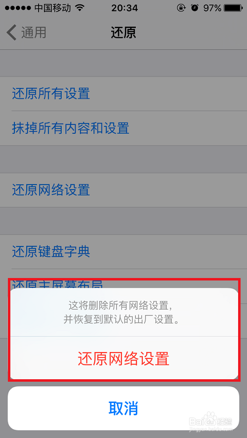 如果以上兩種方法不可行,再試試這個辦法,在設置頁面往下滑動,找到通用,再點擊進入其中的還原,接著點擊還原網絡設置,這時候要我們確認一次鎖屏密碼,輸入之后就可以進行還原網絡設置的操作。ps:這個程序操作之后,原本iPhone手機上的所以網絡信息,包括連接wifi密碼以及相關參數設置都會被清空。